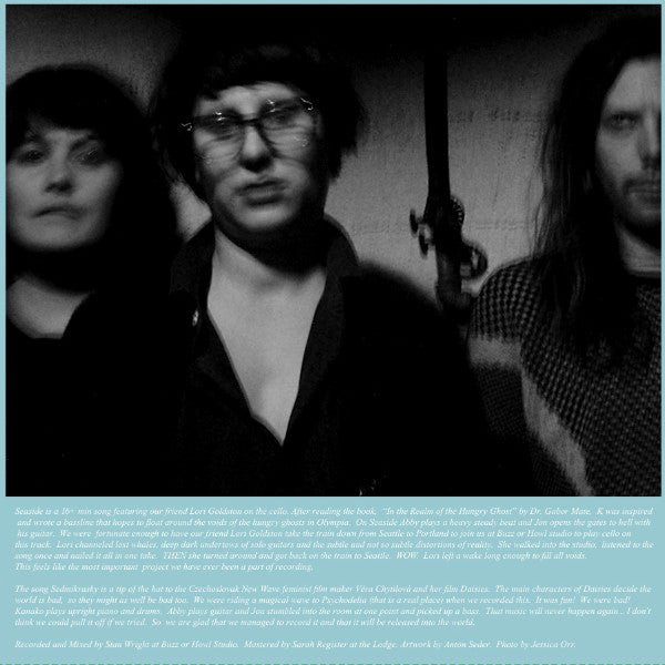 "Seaside is a 16+ min song featuring our friend Lori Goldston on the cello. After reading the book "In the Realm of the Hungry Ghost" by Dr. Gabor Mate, K was inspired and wrote a bassline that hopes to float around the voids of the hungry ghosts in Olympia. On Seaside Abby plays a heavy steady beat and Jon opens the gates to hell with his guitar. We were fortunate enough to have our friend Lori Goldston take the train down from Seattle to Portland to join us at Buzz or Howl studio, listened to the song once and nailed it all in one take. THEN she turned around and got back on the train to Seattle. WOW. Lori left a wake long enough to fill all voids. This feels like the most important project we have ever been a part of recording.